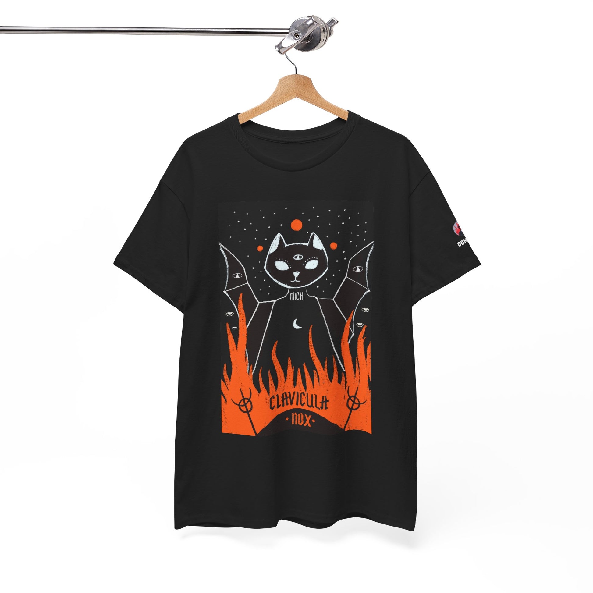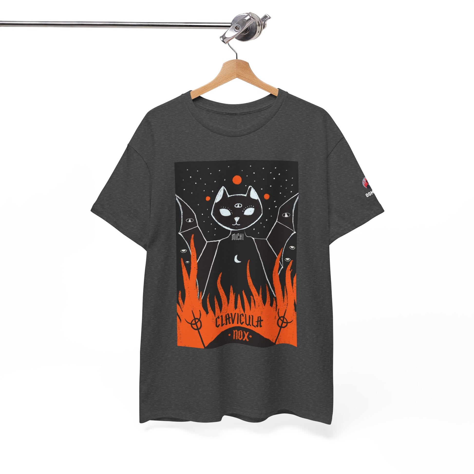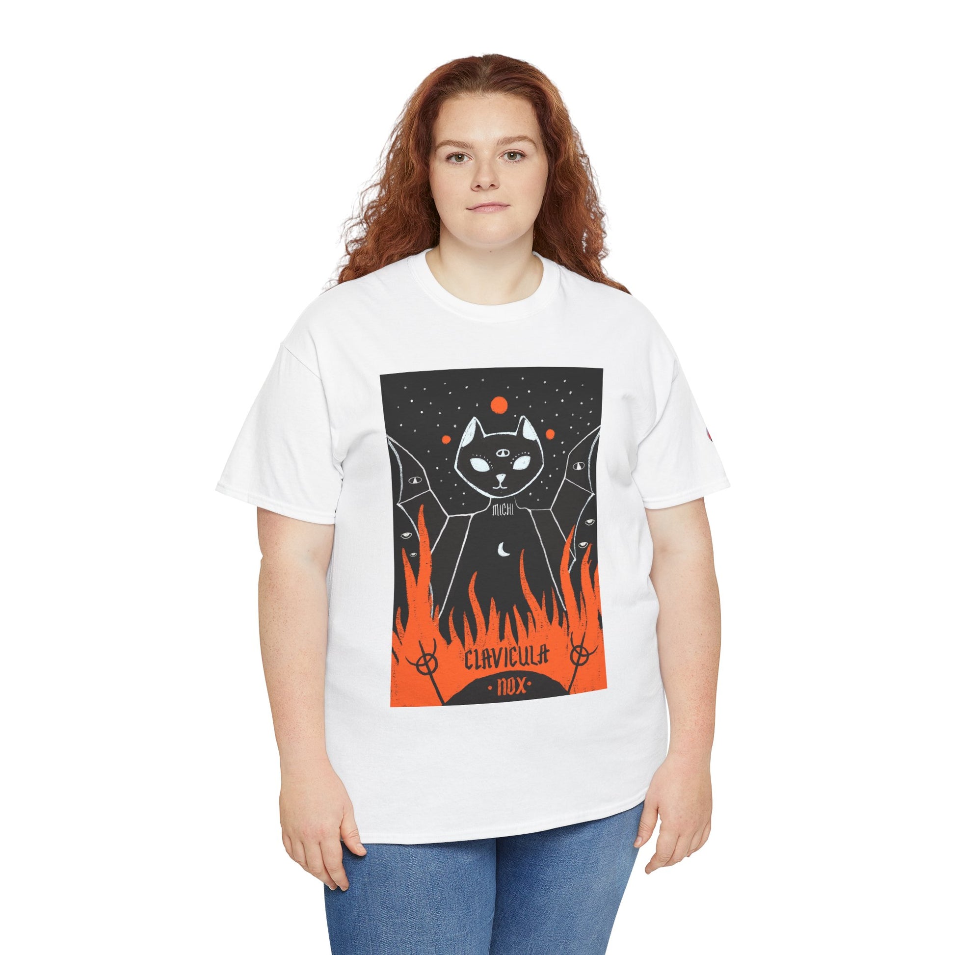 This soft, classic-fit tee carries a bold occult-inspired print: a moonlit cat figure framed by rising flames and occult symbols in stark black and orange. It feels like a midnight ritual in fabric — quiet, tactile, and a little dangerous. Wear it to late-night shows, weekend hangouts, or while sketching in a dim café. The medium-weight cotton holds print detail sharply and keeps its shape, while the crew neck and relaxed cut make it easy to layer under jackets or wear on its own. Fans of witchy aesthetics and indie art will notice the subtle nods to celestial themes and the hand-drawn look of the illustration.